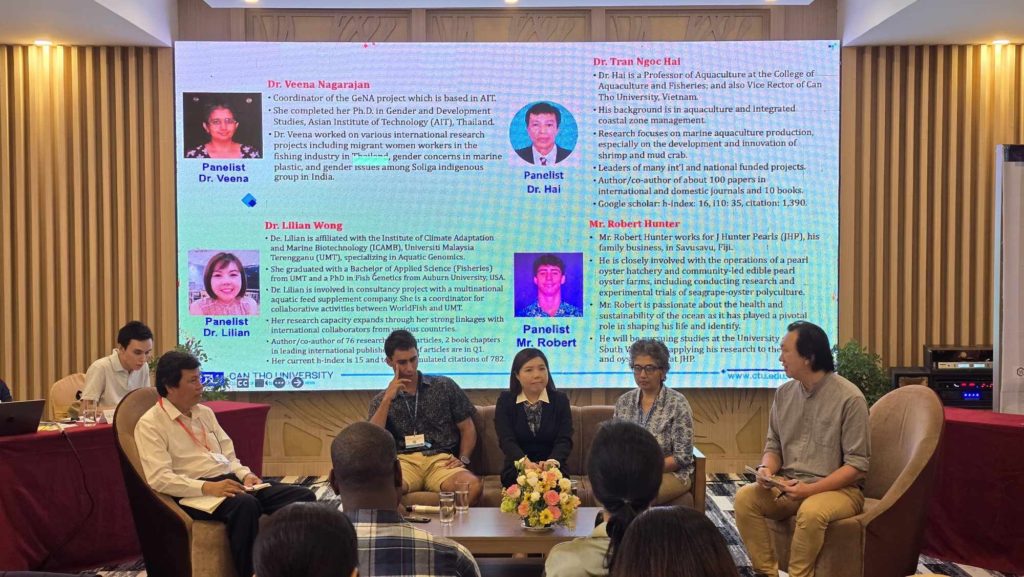 Dr. Veena N., representing the GeNA project, served as a panelist in the discussion titled “Nature-based Solutions and Aquaculture in the Asia-Pacific Region” on October 19, 2024. This session was part of the “International Conference on Aquaculture (ICAF2024): Panoramic View of Innovations,” held in Phu Quoc, Vietnam. Hosted by the USER project under the IDRC AQUADAPT program, the panel was organized by Chiang Mai University’s Unit for Social and Environmental Research in collaboration with Can Tho University, Vietnam. Joining Dr. Veena N. on the panel were Dr. Lilian Wong from the CAINA project, Dr. Tran Ngoc Hai from the USER project, and Mr. Robert Hunter from the Aqua-Pearl project.