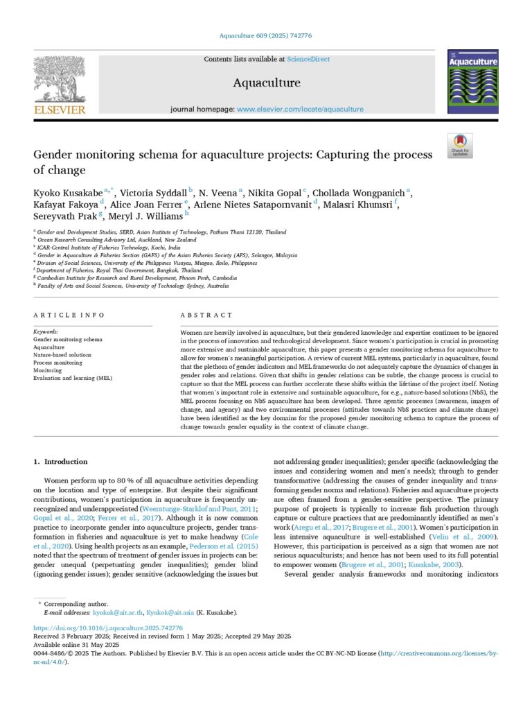 Doing a deep dive into monitoring, evaluation and learning frameworks, we found a significant gap: these frameworks fail to capture the “how” of changes in gender roles and relationships over time. These shifts are often subtle but crucial, especially when working toward gender equality and climate resilience. Therefore, we have developed the gender monitoring schema, a process monitoring tool which reflexively monitors “how” gender roles in NbCS aquaculture are changing over five key domains. Keeping the context very much at the forefront of analysis, the schema leads towards the meaningful engagement of women (and potentially other marginalized groups), in turn leading to gender equality and empowerment of women. This is a path to understanding how gender transformative changes happen, so that projects can support and speed it up through the process of inclusive innovation. Let’s make space for gendered wisdom to shape the future of aquaculture.